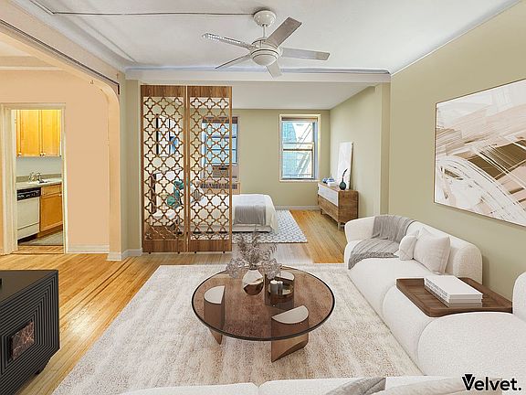 Welcome to 3J at The Normandy, a bright and extra-large alcove studio that functions beautifully as a Junior-1. A generous entry foyer transitions into a grand living/sleeping area with room for distinct zones—living, sleeping, dining, and a home office. A Japanese-style shoji sliding partition currently defines the sleeping/office alcove; keep it for privacy or the seller can remove. The separate kitchen offers great storage and prep space, and the windowed full bath completes a smart, classic layout. High ceilings and hardwood floors enhance the airy, elegant feel.