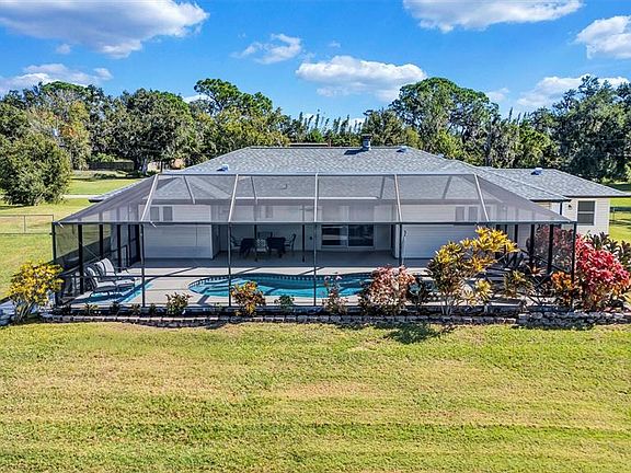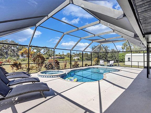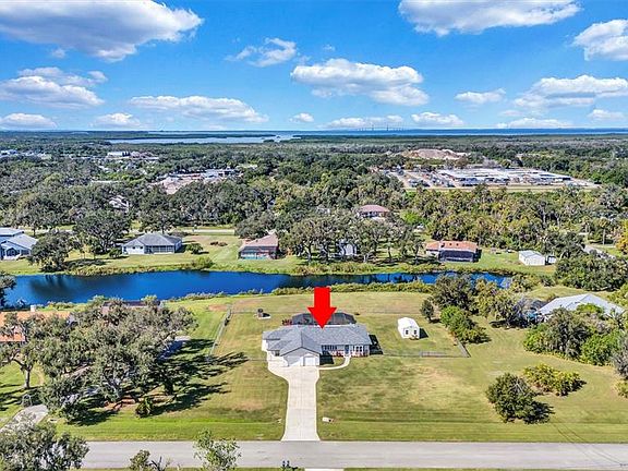 Rare find! Have you been craving an escape from the hustle and bustle of city life and desire to live in the country, but the commute seems a bit too far? Then you just found your dream home, free from HOA living, tucked away in a quiet neighborhood nestled on 1.27 acres of sprawling green lawn in a serene setting overlooking a beautiful pond. Imagine bike rides in the country, while still being 5 min from grocery stores, shopping, restaurants, and I-75 for easy commute. This one story home offers 4 bedrooms, 2 baths, a 2 car garage, plus outside storage shed, and a small bonus room off the garage that could serve as your perfect private office, hobby room, or just extra storage! In the evenings watch as the sky fills with purple, orange, and pink hues on your oversized, screened lanai while taking a dip in your heated pool or spa or throw a football in your fenced in field. Updates include new roof (2022),new septic tank (2023), well pump and well head (2024), wood look tile throughout, epoxy coated garage floor, new bathroom vanity in guest bath, and freshly painted pool deck. Bring your boats, trailers, and pets because there is no HOA and a large fence with wide opening for trailer access. Perfect place for your own garden. Get your slice of paradise while you have the chance. Short drive to both Anna Maria Island or St. Pete beaches. Schedule your showing today!