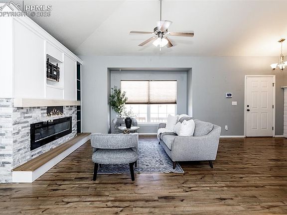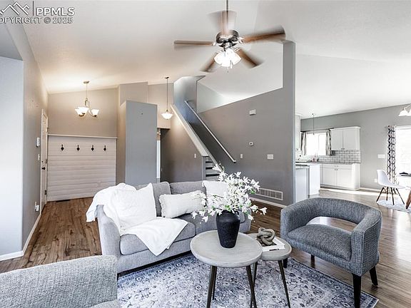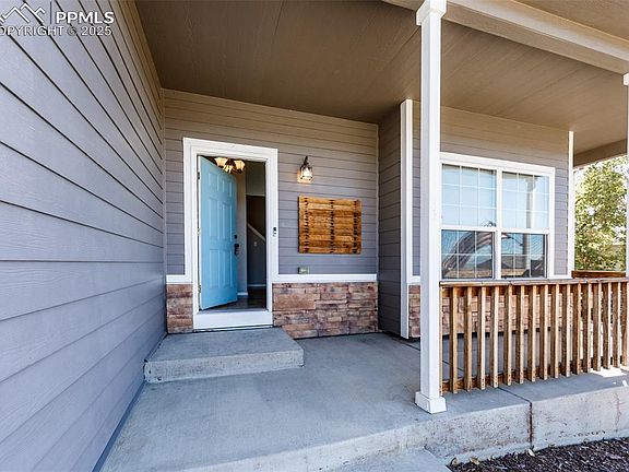 Nestled at the end of a quiet cul-de-sac, this beautiful 4 bed, 3 bath home sits on a spacious ½-acre lot with incredible mountain views from the front porch and upstairs bedrooms. The exterior features low-maintenance xeriscaping, and a large 3-car garage with built-in shelving, ceiling fans, openers on both doors, and a side parking pad perfect for an RV, boat, or trailer. Enjoy relaxing on the covered front porch or entertaining in the fully fenced backyard featuring dual gates, sprinkler system, raised garden beds, a fire pit area, mature trees, and two composite decks. Inside, the bright and open main level showcases laminate wood floors, vaulted ceilings, and a cozy custom-built electric fireplace with stone surround, natural wood mantle, and clever built-in shelving for electronics. The kitchen offers granite countertops, a large island, white cabinets with crown molding, subway tile backsplash, pantry closet, and newer stainless steel appliances including an air-fryer oven and WiFi-enabled range. The adjoining dining area opens to the upper deck for easy indoor-outdoor living. Upstairs, the primary suite features a huge walk-in closet and a beautifully updated bath with granite double vanity, vessel sinks, soaking tub, and separate walk in shower. Three additional bedrooms each include ceiling fans, and the full hall bath complete this level. The lower level includes a large family room with walkout to a second deck, convenient half bath, and laundry room with cabinets and folding space. The unfinished basement provides room to grow with two garden-level windows, a workbench, and rough-in for a future bath. Additional highlights include central A/C, humidifier, radon mitigation system, whole house water filtration, generator hook-up, and 2020 water heater. Close to schools, shopping & dining options, and a short commute to all military installations.