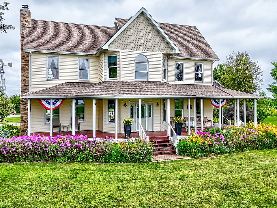 Proudly presenting this charming two-story, 3.83 acre farmette, with a pond and outbuildings, located in Blackstone. This beautifully redone farm home features a welcoming wrap-around front porch, perfect for relaxing and enjoying the sights and sounds of nature. Inside, the grand foyer features volume ceilings, a dramatic staircase, and leads to a spacious living room with a wood-burning fireplace, and a formal dining room with french doors that overlooking a private rear yard. Flanking the foyer, the eat-in cook's kitchen perfectly blends historic details with modern amenities and includes a center island with custom cabinetry. A back porch and full bathroom, featuring a clawfoot tub, rounds out the main level. The upper level leads you to a large sitting area/office space, and leads to 3 large bedrooms, as well as a second, full, large bathroom with separate shower and corner bathtub. The primary bedroom features its own wood-burning fireplace. Outside, welcoming landscape and pathways lead you to multiple buildings, including a modern workshop/garage equipped with 220 electrical service, a furnace and air conditioning. An additional shop building measures 23x30 and features a wooden floor and wood-burning stove. A large 32x43 barn includes a hayloft, chicken coop with a large outdoor run, while a 27x35 crib offers dry storage, a saw shop, and a dock by the pond project. An additional wood heating system and solar panels make this property more environmentally friendly and economical. This one-of-a-kind property includes a circle driveway, mature trees, and well-maintained landscaping with fruit trees, ensuring a picturesque and functional rural retreat.