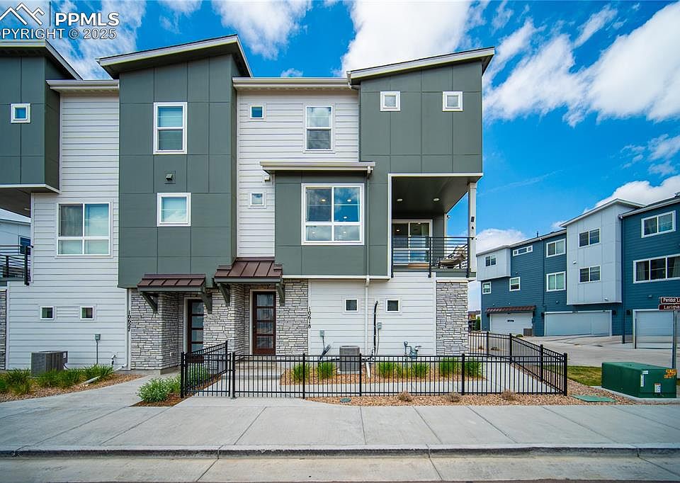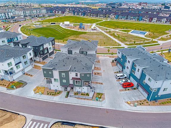Welcome to low-maintenance living in the highly sought-after Commons at Victory Ridge! This stylish 3-story townhome is a former Lokal model home, showcasing premium finishes and thoughtful upgrades throughout. Featuring 2 spacious bedrooms, 2.5 bathrooms, and an attached 2-car garage, this end-unit offers added privacy and an abundance of natural light. Enjoy an open-concept main floor with a bright and airy living space, a large kitchen island perfect for entertaining, and a balcony just off the dining area—great for morning coffee or evening relaxation. The kitchen boasts stainless steel appliances, including a gas range, and modern design touches. Upstairs, you'll find the primary and secondary bedrooms, each with adjoining bathrooms for added comfort and convenience. Located in the top-rated Academy District 20, this home is close to everything! Walk or bike to Shops at Victory Ridge, Icon Cinema, Topgolf, Interquest Marketplace, and an incredible variety of restaurants, gyms, and entertainment options. Easy access to I-25 makes commuting a breeze. Whether you're looking for your first home, a smart investment, or the perfect lock-and-leave lifestyle, this move-in-ready townhome has it all—style, location, and convenience!