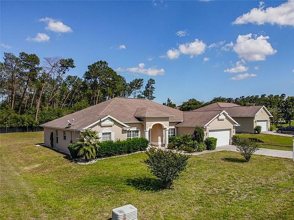 A spacious 4/3/2 split plan well-maintained home with wonderful curb appeal. A very large open spaced kitchen with a bar counter and a separate nook that has a sliding door accessing the covered Lanai. The kitchen counters are Corian, the cabinets are wood and it also has a pantry. Plenty of storage. The nook and the kitchen along with all 3 bathrooms have ceramic tile for flooring. The formal dining room, family room, and sitting area have Pergo laminate flooring. All 4 bedrooms are carpeted. The master bedroom is roomy as can be, with his and her walk-in closets. The master bathroom has his and her sinks, walk-in shower with a garden tub. Plenty of room in here too. The walls have rounded corners and the family room can hold many comfortably, next to a cozy sitting area upfront. Enjoy the 4th bedroom at the far back of the house serves as mini-suite direct access to the 3rd bathroom and this bathroom has direct access to the lanai. ( Will make a great pool home with this layout ). Outside the backyard is a large open area that is partially fenced. There is a well that is dedicated to irrigation. All appliances are included. Seller offering Home Warranty with a value of $500 through Old Republic. Refrigerator, Range, Microwave, Dishwasher, Washer, and Dryer. Exterior and Trim was just freshly painted 3/5/2020