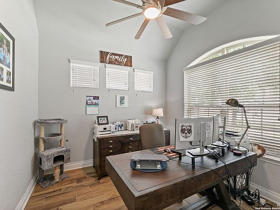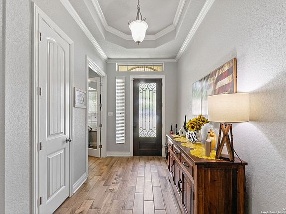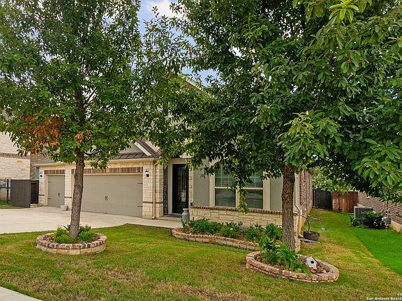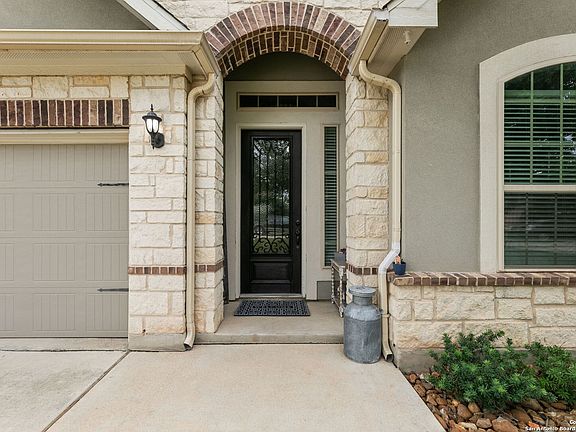 Discover the unique features of this wonderfully designed Ashton Woods home, boasting a multi-generational plan and numerous builder's upgrades. The flexible upper-level show cases a wet bar, sink, refrigerator, and a spacious 4th bedroom complete with a walk-in closet. Luxurious amenities abound, including a walk-in jet tub, and bidet toilet. The Master Suite, which is conveniently situated on the main level alongside a primary bath featuring separate vanities and walk-in closets. Enhanced by wood-look tiles and 8' doors throughout the lower level, this residence also offers carpeting in the two-guest bedrooms. Additional highlights encompass a separate office, a formal dining room or use as a flex room, a generous kitchen with a gas cooktop, and an abundance of storage space. Noteworthy seller upgrades include 26 solar panels to reduce monthly electricity costs, a Solaris PCO, IAQ Air Purifier system, and water softener. Delight in approximately 480 sq ft of expanded patio space featuring a charming fire pit, as well as a low maintenance fenced backyard with artificial grass. The property is equipped with a 7-zone irrigation system and two separate attics for added functionality. Short drive to medical, shopping, the rivers and Schlitterbahn activities. This home is a must see!