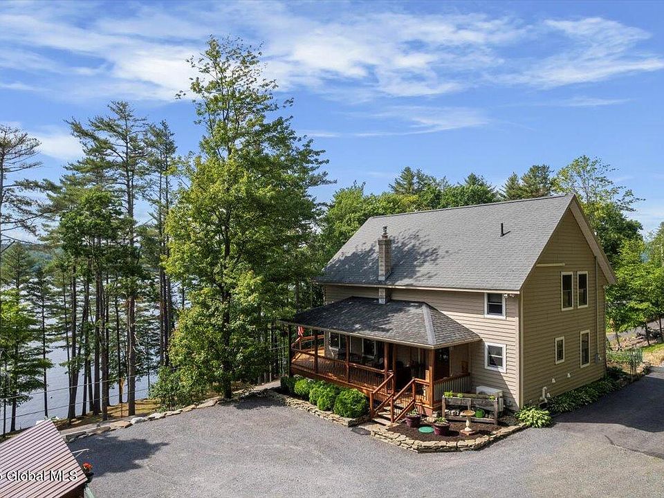 Experience lakefront living at its finest w this beautifully designed 3/4 bedroom custom home, nestled on a low-maintenance lot w 140' of deeded frontage on Sacandaga Lake! 3 levels of spacious living w stunning lake views from nearly every room. The main level features a open-concept kitchen & dining area, a cozy living area w wood stove, a full bath, laundry room & a guest bedroom. Upstairs, the primary ensuite is complete w luxurious bath, WI closet & an adjoining room ideal for a nursery, office, or extra bedroom. The lower level offers a large family room, bedroom, an office & a half bath. Covered porch & a spacious front deck to enjoy the lake views. A 40' dock with a 12' x 12' platform perfect for summer gatherings! Don't miss this opportunity to make lifelong memories here!!