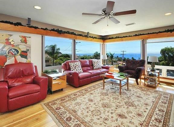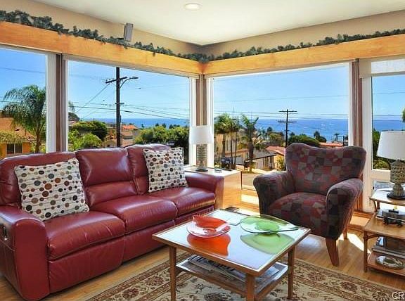 Panoramic, stunning views of ocean and Catalina Island from this remodeled contemporary Palisades home perched high above street level on a pretty corner lot. New dual-pane vinyl windows throughout, hardwood flooring in living room, dining room and all bedrooms. Gorgeous granite kitchen with maple and glass cabinetry, breakfast bar, top-of-the-line appliances, decorator lighting with adjacent dining area. Oversized Master Suite was recently added with high ceilings,hardwood flooring, wall of lami-glass closet, sitting area and French doors leading to terraced private patio area with firepit and views of the ocean. Downstairs is a spacious finished basement or "man-cave" ...great for entertaining. Two-car attached garage. Located just a short walk to one of California's premiere windsurfing and surfing beaches, the Wildlife Nature preserve and the popular neighborhood "Corner Store."