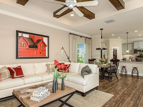 Fresh Spring by Neal Communities features an open concept design.. The kitchen, open to the café dining area and great room, includes an island and a walk-in pantry. Beyond the great room a covered lanai can include an outdoor kitchen wall. This plan gives you to the option of having an outdoor kitchen wall on the lanai. The master suite includes a walk-in closet and a master bath with walk-in shower and private water closet. The home features a leisure room which can be made into a den. Other options include coffered ceilings in the great room and master bedroom, laundry tub in an expanded laundry room, and dual sinks in the both bathrooms.Find out more about Fresh Spring at Silverleaf in Parrish and tour the model homes. Come by or call to schedule your appointment!