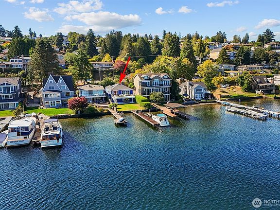 Experience the ultimate lakefront lifestyle with 40’ of prime Lake Washington waterfront! This low-bank property offers moorage, dock, and boat slip. Take in stunning views of the lake, mountains, and city from this beautifully finished home. A large deck creates the perfect space for entertaining. The main floor boasts a great room with kitchen, dining, and living areas, featuring oak hardwood floors and cherry cabinets. The primary suite includes an en-suite bath with dual shower and two-person jetted tub. The lower-level “Lodge” style family room highlights a striking river stone fireplace. Nestled on a quiet private lane, this home combines serenity, comfort, and unmatched waterfront living.