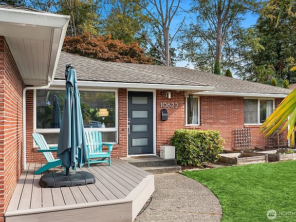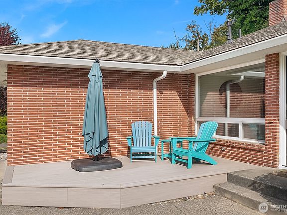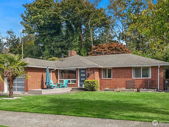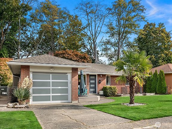 Stunning mid-century ranch in the sought-after Crown Hill neighborhood. The inviting living and dining room feature hardwood floors and a wood-burning fireplace with a brick surround, creating a warm and welcoming atmosphere. The dining room connects to an updated kitchen with modern finishes and a built-in breakfast nook. A second living room with laminate flooring and a wood-burning fireplace offers additional space for entertaining. Sliding doors open to an expansive deck surrounded by lush landscaping. All three bedrooms are on one level. Additional highlights include A/C, an attached one-car garage, second deck, and a prime location near Carkeek Park, local schools, grocery stores, and restaurants, with easy access to HWY 99.