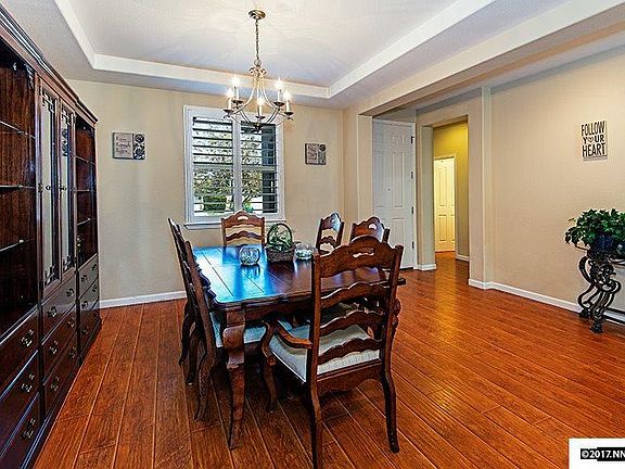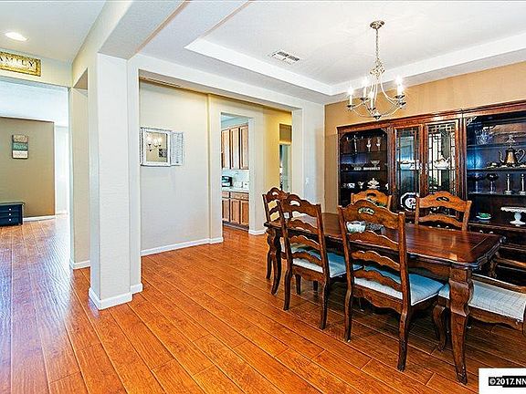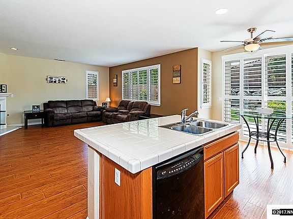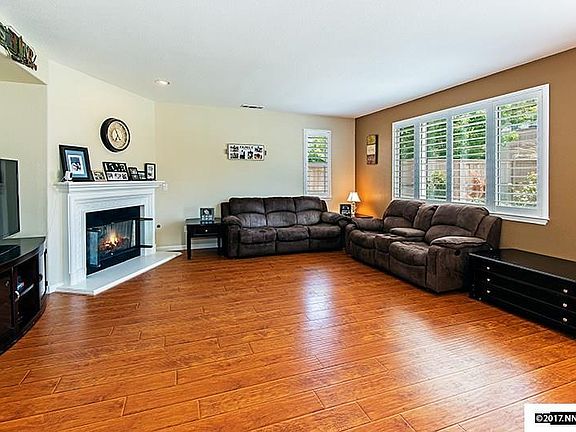 You'll love this awesome floor plan and desirable location of this single level Damonte Ranch home! 1697 +\- sq ft with large living areas, 3 bedrooms, 2 baths and 2 car garage. Move in Ready! Updated laminate & plantation shutters throughout. Kitchen opens to family room with cozy gas fireplace, formal dinning and ideal bedroom separation. Master suite with ceiling fan, large walk in closet, double sinks & garden tub. Close to shopping & schools. Don't miss this one! Call for a private showing today.