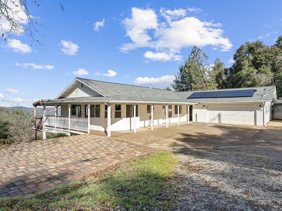 Spectacular Vista Views in Columbia! Sitting on approximately 10+ acres at the very end of a country road, this home is in the perfect spot if privacy and tranquility are what you crave. A cheerful interior offers an open floor plan with open beam ceilings, mountain views and a wood burning fireplace to keep you warm in winter. The remodeled kitchen offers a butcher block top island with a prep sink, gas oven, breakfast bar and ample drawers. A granite slab accents the back counter, with display cabinets above. With an open dining room concept, you can have any size table and easily accommodate a crowd. There are 3 bedrooms upstairs and a bedroom downstairs with another room! The wrap around, covered porch is a welcoming space. Tesla solar panels have been installed to offset the increasingly high rate of electricity. Dual zone central heat and air, 2 RV hookups with electric and septic access and so much more! This home is minutes from the local airport making it perfect for flying enthusiasts and it is minutes from Columbia State Historic Park. Have you had big dreams to live in the country? This may be the home for you!