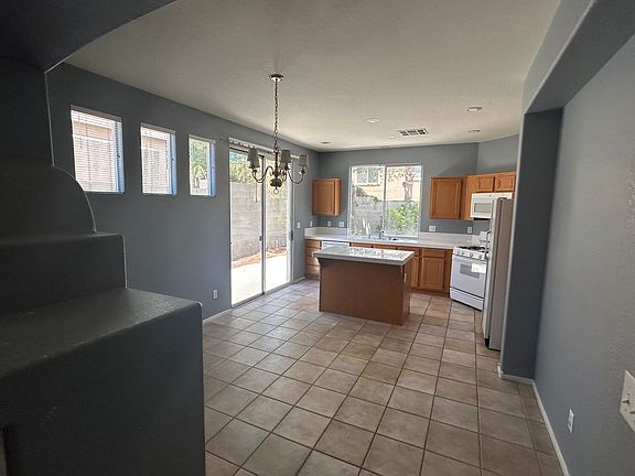 The bright eat-in kitchen boasts a functional prep island and comes fully equipped with all appliances, including a microwave, refrigerator, washer, and dryer. Beautiful tile flooring flows throughout much of the home, adding a touch of elegance and easy maintenance.