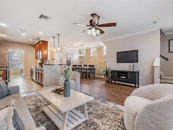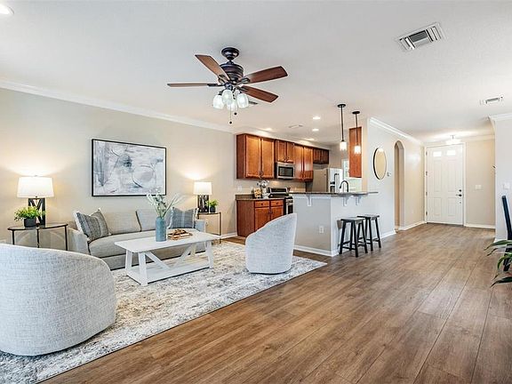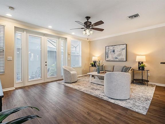 STUNNING 3 BEDROOM, 2.5 BATHROOM TOWN HOME WITH PRIVATE COURTYARD IN HIGHLY SOUGHT LONGLEAF! This End Unit Town Home has it all and is located on a corner lot with a 2 Car Garage! As you walk inside, you will appreciate this open downstairs floor plan that combines the kitchen, dining, and family room creating the perfect space to entertain or spend quality time with friends and family! This kitchen boasts Granite counter tops, Stainless Steel Appliances, 42" wood cabinets, and breakfast bar! Most of the downstairs has newer Luxury Vinyl Plank Flooring, Crown Molding, and a beautiful brick accent wall in the dining area! There is also a spacious half bathroom downstairs that has been updated! French doors lead out back to the private screened-in lanai that seperates the home from the 2-car garage. The lanai is truly a retreat for relaxation! All 3 bedrooms and 2 bathrooms are located upstairs. This Primary Bed/Bathroom features a walk-in closet, Dual Vanity topped with Granite, and a Walk-in shower! All bedrooms have ceiling fans! All of this in the highly sought green community of Longleaf which provides easy access to Tampa and Clearwater! Longleaf amenities include shops/restaurants, clubhouse, heated pool/spa, parks, playgrounds, walking trail, tennis/beach volleyball/basketball courts, baseball field, and plenty of community events throughout the year! Longleaf Elementary and Longleaf learning center located within the neighborhood! And just a short walk to Starkey market! Schedule your showing today!