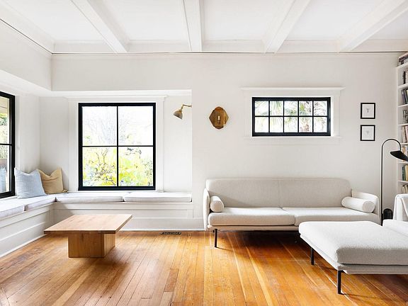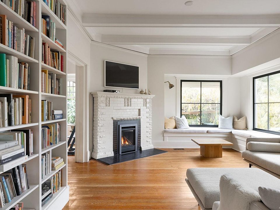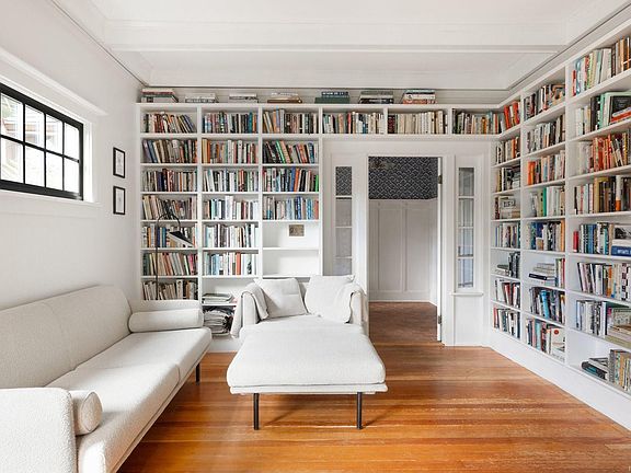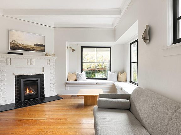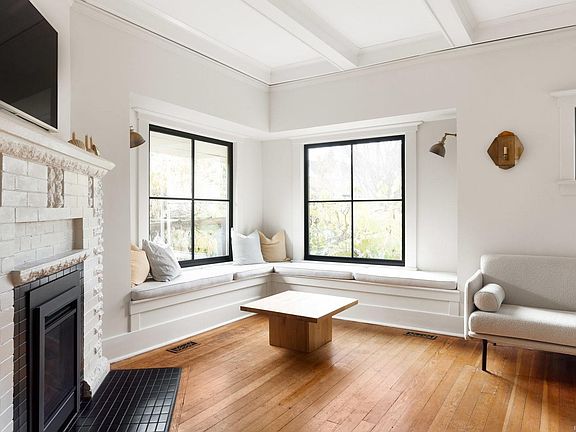 Formal foyerNew gas fireplaceBright corner windowsCustom built-in bookshelfSpacious dining roomBeautiful period built-insChic kitchen