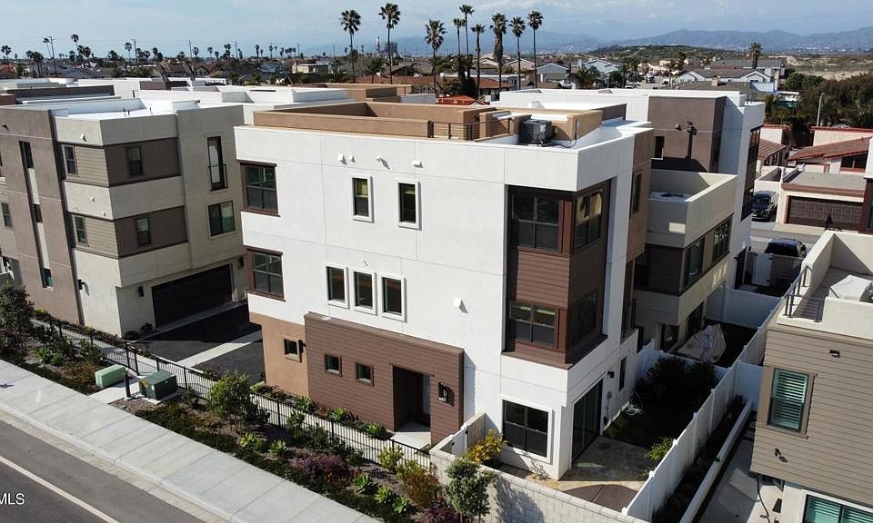 Modern beach living at Shoreline 50 by Williams Homes with 4 bedrooms (including 2 main suites), 4 bathrooms and a large rooftop deck with amazing 360 panoramic views of the ocean, islands, mountains and more. First floor features a private main bedroom with en-suite bathroom and access to the yard space with flagstone patio and spa. The gourmet kitchen boasts designer GE Cafe appliances, quartz counters, tile backsplash, huge center island with pendant lights and a cozy outdoor deck perfect for morning coffee. The spacious great room and dining area provide plenty of space for gatherings with several large windows providing lots of natural light.Additional features include newer luxury vinyl wood flooring, ceiling fans, community pool, spa and recreation room.Enjoy biking, boating, Sunday Farmers Markets, and walks to the beach! Home is minutes from restaurants, the Channel Islands Harbor and halfway between Malibu and Santa Barbara.