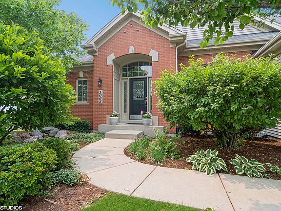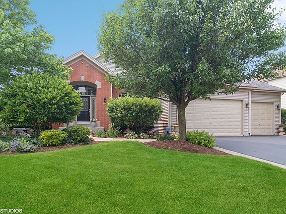 Like New- Exceptional Blackberry Creek J Carl Custom Built Ranch with thoughtful design & impressive trim. This beautiful home is the original builder's model and features soaring volume ceilings throughout, hardwood floors, dining room, living room with a floor to ceiling gas log fireplace, powder room, well-designed kitchen with maple cabinets, granite countertops, stainless steel appliances, breakfast bar, separate eating area, walk-in pantry & 3-car garage. Luxurious primary bedroom suite with separate shower/jetted tub & dbl. vanity. Two other bedrooms share another full bath. Deep pour, finished, walkout english bsmt with heated floors, full bath, kitchenette, den/office, wall of cabinetry, and another gas log fireplace. Additional features are a whole house vacuum system, & security system. Spend time on your maintenance-free deck or brick paver patio, overlooking the professionally landscaped yard, & fenced back yard. Conveniently located +/- 1 Mile to Metra station and elementary school. This wonderful community features ponds, walking trails & playgrounds. This exceptionally maintained home has been pre-inspected w/ all corrections completed. This one won't last long!