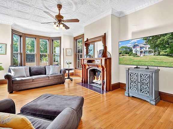 Wraparound porchScreened porchSoaring ceilingsFour original fireplacesGingerbread trimIntricate millworkCarved mantels
