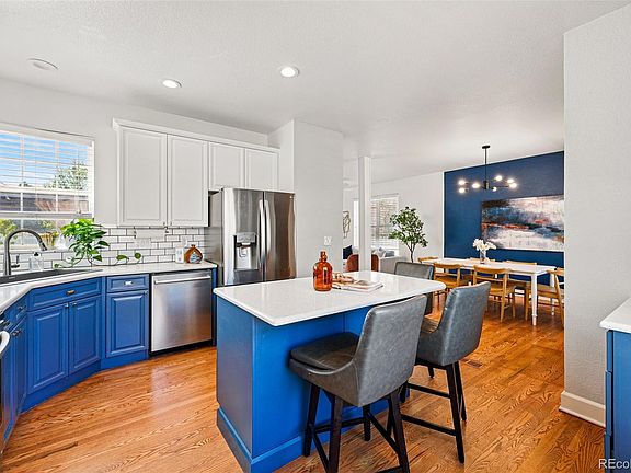 Located in the highly desirable Lowry neighborhood, this stunning 4-bedroom, 4-bathroom home offers generous living space and modern updates throughout. From the moment you step inside, you'll be greeted by gleaming hardwood floors, soaring vaulted ceilings, and an abundance of natural light. The main level features a spacious open-concept layout, ideal for both entertaining and everyday living. Enjoy cozy evenings by the fireplace in the large family room, host gatherings in the dining room, and cook with ease in the updated kitchen complete with quartz countertops and stainless steel appliances. Upstairs, you’ll find three spacious bedrooms, a versatile open loft area, and a convenient laundry room. The luxurious primary suite includes a large walk-in custom closet and a beautifully appointed en-suite bath. Step outside to a professionally landscaped backyard oasis, featuring a generous patio and a pergola, raised garden beds, fruit bearing trees (apple and peach), raspberry bushes and a strawberry patch—perfect for outdoor dining or hosting guests. Additional highlights include a two-car garage with ample storage space, custom closets throughout, and an unbeatable location just steps from a charming pocket park. You'll love being only five miles from downtown Denver, four miles from Anschutz Medical Campus, and eight miles from the Tech Center, with easy access to Cherry Creek, Lowry Town Center, and local parks. Don’t miss this exceptional opportunity to own a thoughtfully designed home that blends comfort, luxury, and convenience in one of Denver’s most coveted neighborhoods!