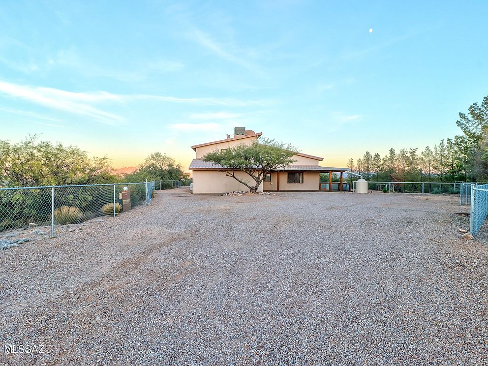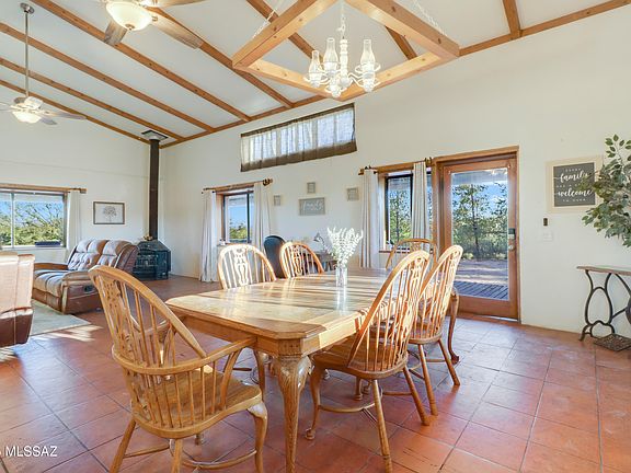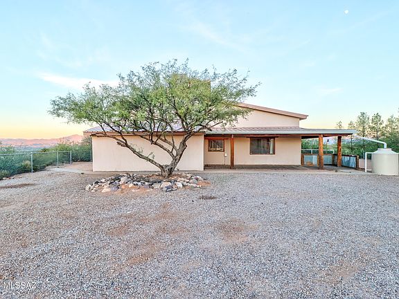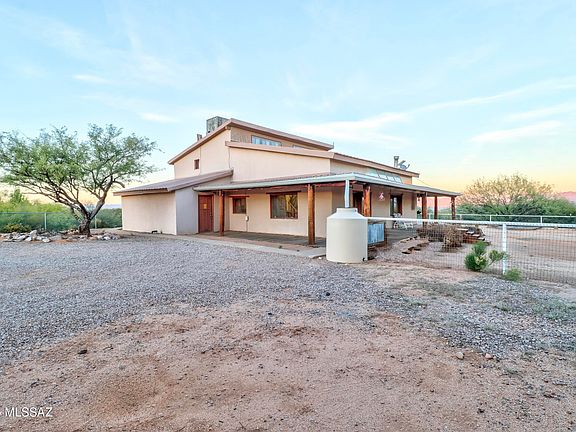 This 6-acre property sits just off a paved road and offers an easy commute to Tucson or Sierra Vista. This two-story home includes three bedrooms, two baths, a two-car detached garage, a guest house with a full bath and kitchen, and a two-stall horse setup. Inside, you'll find vaulted ceilings with exposed beams, an open floor plan with a spacious great room, a wood-burning fireplace, and a loft that works well as an office or den. The large primary suite includes dual vanities, a garden tub, and a separate shower. There's also an oversized laundry room with a sink. The wraparound deck offers wide views in every direction. No HOA.