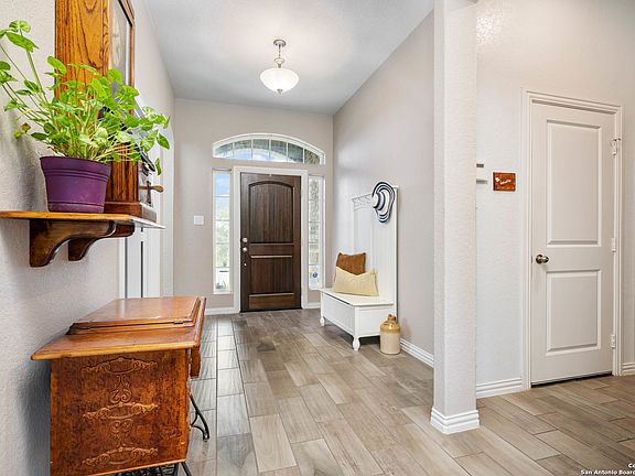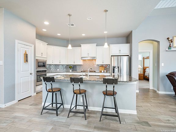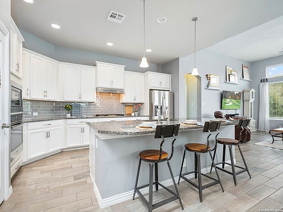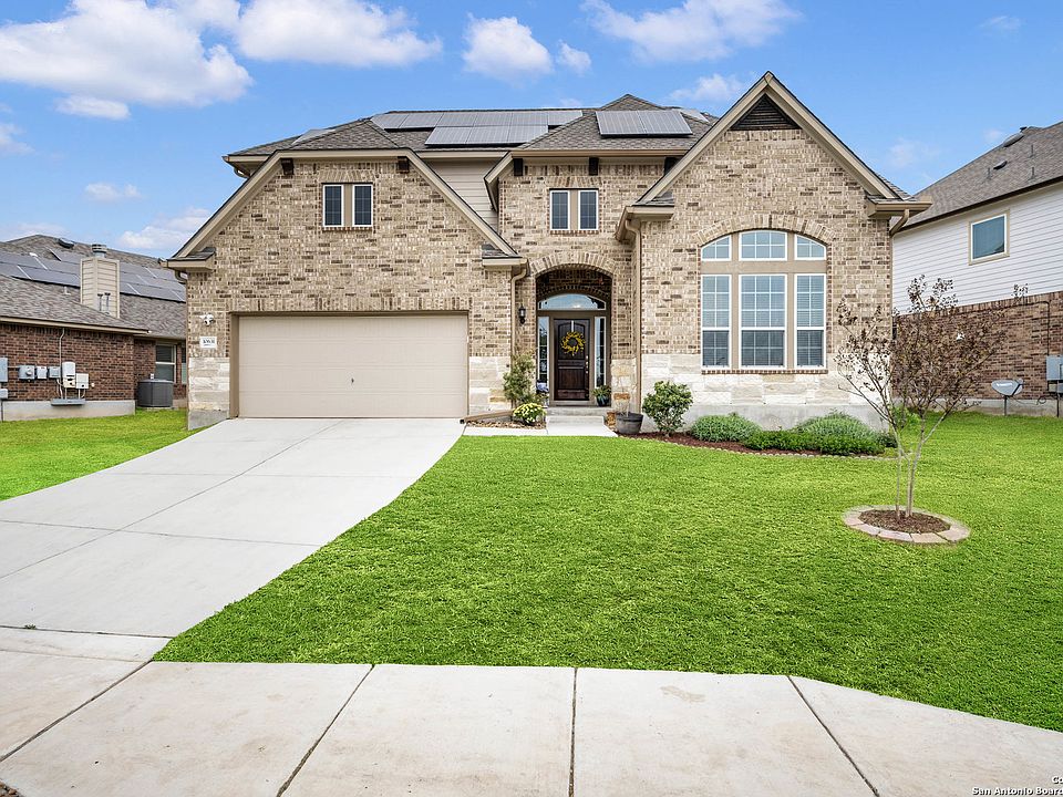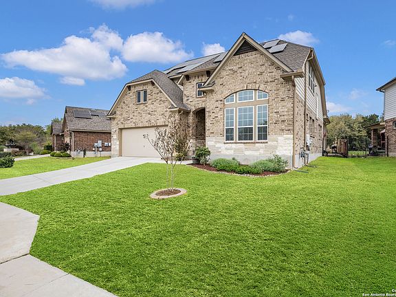 OPEN HOUSE SUNDAY: MARCH 18TH & 19TH 12-5PM. Gorgeous 2-story David Weekley home in Triana. New Roof (2019), SOLAR PANELS/BATTERY (2018/2022). Spacious floor plan, perfect for entertaining! This beautiful home showcases a gourmet kitchen w/ a huge granite island, 42" kitchen cabinets, stainless steel appliances and wrap around granite countertops. This immaculate home features an open concept living room with plank tile flooring, high ceilings and stunning windows with custom wood blinds, bringing in tons of natural light. The downstairs primary suite is a spacious room with a luxurious, spa-like bath with a garden tub and shower, double vanities and an extended walk-in closet. Downstairs also includes a secondary bedroom perfect for guests or a mother-in-law suite with a full shower and a lovely office with French doors for privacy. Upstairs has two additional large bedrooms, a massive game room and media room. Relax on the covered patio with an extended flagstone area great for backyard BBQ's with the privacy of the lush greenbelt. This home is a must see with too many extras to list. Please see addl' docs. The home is close proximity to 1604, Lackland AFB, shopping and Top-rated NISD schools. Schedule a showing today as this home will go quickly!