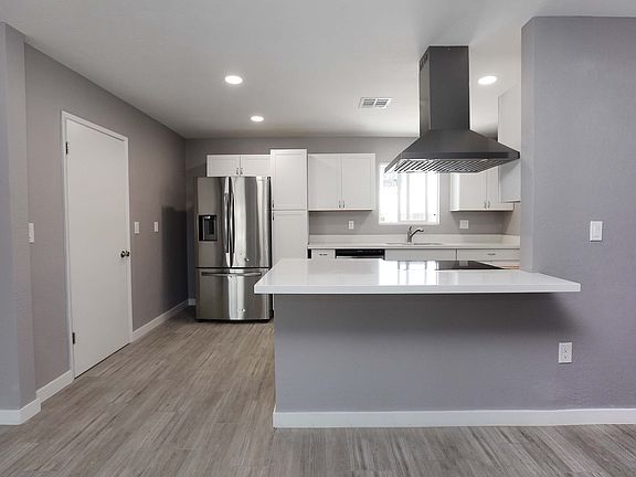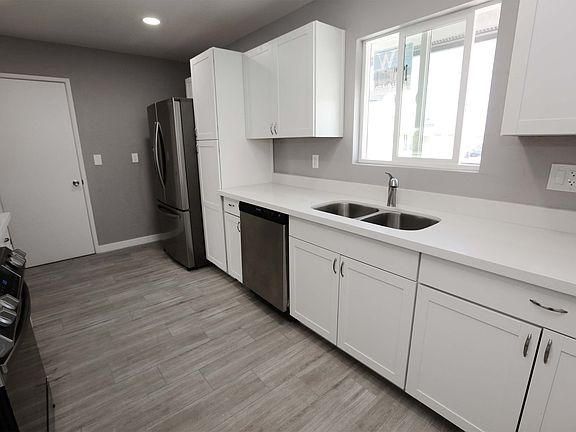 A lovely renovated 3-bedroom, 2-bathroom gem in the Adult Community (1 member of household must be 55+) of Sun City is now available! Flaunting a vast front yard, dual-carport, and extended driveway, this residence captivates from the outset. The double-door entry reveals a chic interior with a contemporary palette, sleek wood-tile flooring, and a sizable living room complemented by sliding glass doors to a serene back patio. The immaculate eat-in kitchen showcases sparkling SS appliances, ambient recessed lighting, gleaming granite counters, crisp white cabinetry, and a peninsula with a breakfast bar. Retreat to the primary bedroom, which boasts a pristine private bathroom and a large walk-in closet.