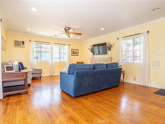 Bright, open floor plan featuring real hardwood floors, recessed lighting, and ceiling fans throughout.