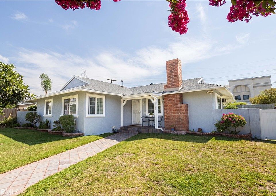 Eye-catching curb appeal with fresh paint, textured stucco, vinyl fencing, and custom-trimmed windows.