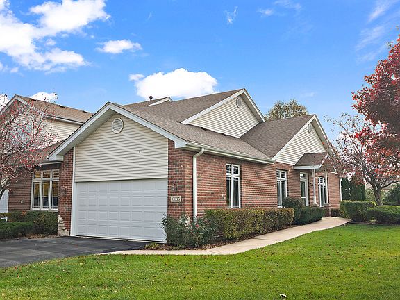 This beautifully reimagined end-unit RANCH TOWNHOME blends luxury design, effortless comfort, and serene views of open green space. Bathed in natural light and completely transformed from top to bottom by a professional designer, this home has been rebuilt with a level of craftsmanship and character rarely found in new construction, every detail curated for beauty, comfort, and longevity. Every surface has been curated from lighting and hardware to flooring, cabinetry, and finishes, creating a cohesive and truly elevated living experience. Step into the custom-designed kitchen featuring Styleline cabinetry, Bosch appliances, and a Wolfe 5-burner cooktop, all thoughtfully placed for both function and flow. Every element has been considered, from full-height 52-inch cabinets extending from base to crown, with roll-out drawers and smart corner storage, to the custom backsplash and under-cabinet lighting that add warmth and dimension. An inviting eat-in island offers the perfect place to enjoy your morning coffee while watching TV or connecting with guests. The dining room, wrapped in windows, provides a stunning backdrop for entertaining, complete with a serving area featuring beautiful glass cabinetry, perfect for displaying your favorite pieces. Red oak hardwood floors in a rich barrel-aged finish flow seamlessly throughout, complemented by upgraded baseboards, enhanced millwork surrounding the windows, and Hunter Douglas window treatments. The living room centers around a two-sided fireplace framed in marble tile, creating an elegant focal point that invites warmth. The primary suite offers a peaceful retreat with a custom walk-in closet and a stunning bath featuring a walk-in shower with built-in grab bars, hand shower wand, and a custom vanity with smart storage. The second bedroom and full guest bath continue the same refined aesthetic with elevated finishes and timeless design. Even the laundry room was designed with the same level of sophistication, featuring custom cabinetry, granite countertops, front-load appliances, and built-in drying racks, creating an elevated sense of beauty and purpose in every detail. An updated deck off the kitchen offers the perfect spot to grill, relax, and enjoy the lush, verdant scenery, blending indoor comfort with outdoor serenity. Additional updates include newer HVAC (2021) and a new garage door and opener. Every finish and flourish reflects a home where thoughtful design, intentional luxury, and effortless livability come beautifully together. Ideally located in Mokena, residents enjoy convenient access to The Oaks Recreation Center and miles of scenic trails within Hickory Creek Forest Preserve, offering a perfect blend of luxury living and outdoor tranquility.