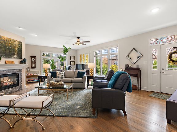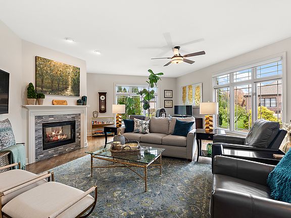 Two-sided fireplaceEnd-unit ranch townhomeBathed in natural lightStyleline cabinetryInviting eat-in islandLush verdant sceneryBosch appliances