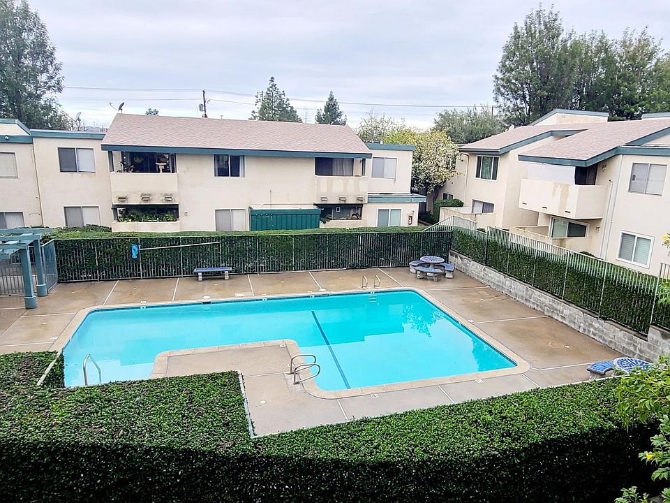 This is the one you've been waiting for! Beautifully remodeled 2 bedroom 1 bath upper unit in a beautiful Condo complex with a pool! Right when you enter this unit you will be wowed by the custom wood vinyl flooring and the beautiful wood beamed ceiling! This open concept layout boasts a remodeled kitchen featuring brand new quartz countertops with an eat up bar, brand new stove/oven, double stainless steel sink and plenty of cabinet space! There is an additional eating area which opens to the living room and patio area where you can relax and see views of the mountain tops. There is a huge master suite with a walk-in closet, ensuite bathroom and tranquil tree views. There is a nice sized 2nd bedroom with pool and tree views. The bathroom features a shower are as well as a separate vanity area with plenty of space and cabinets for storage! Conveniently located below the unit is a beautiful pool area to relax as well as a large community laundry area. The un it comes with 2 parking spaces, storage and is fully secure and gated. Great location! Close to shopping, theaters, restaurants, plus the 118 & 405 freeways. Included in the rent is water, gas and trash! Tenant ONLY pays for Electric