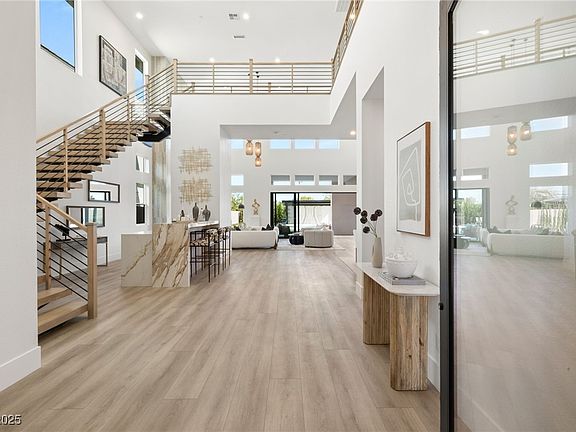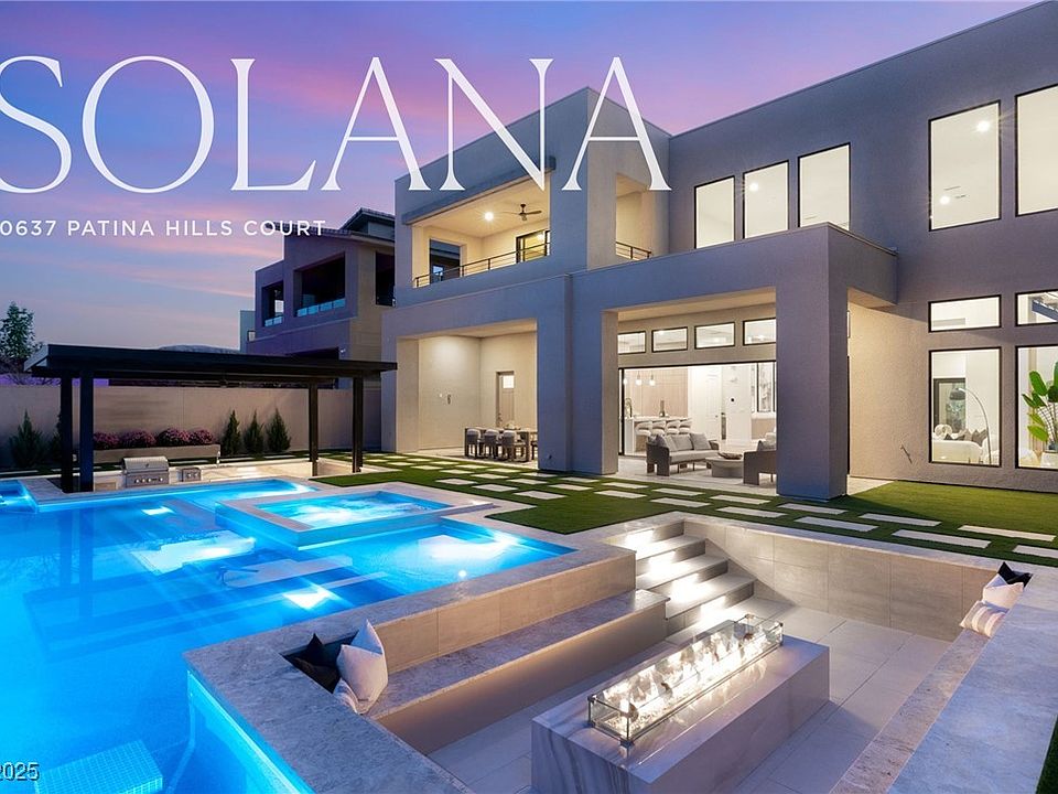 Behind the guard gates of Mesa Ridge, Solana embodies the essence of organic modern design: where architecture, light, and landscape converge in quiet harmony. A sculptural pivot door opens to a sequence of luminous spaces defined by rift white oak millwork, European tile, and bespoke craftsmanship. The kitchen and butler’s pantry, outfitted with top tier appliances, dual ovens, a prep sink, and wine refrigeration, unite elegance with intention. With five en suite bedrooms, including two on the main level, Solana balances intimacy and scale. The primary suite offers a restorative retreat with a steam shower and tailored wardrobe systems. Outdoors, a newly completed 1,000+ sq. ft. pool with sun shelf, professional kitchen, and media pavilion frame sweeping Strip and mountain views. Set within one of Summerlin’s most architecturally significant enclaves, Solana redefines desert luxury for those who live artfully by design.