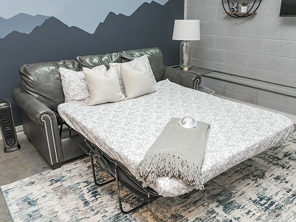 Walk-in closetStylish sleeper sofaTrendy interiorsQueen memory foam mattressFarmhouse sinkSpa-like retreatOpen kitchen