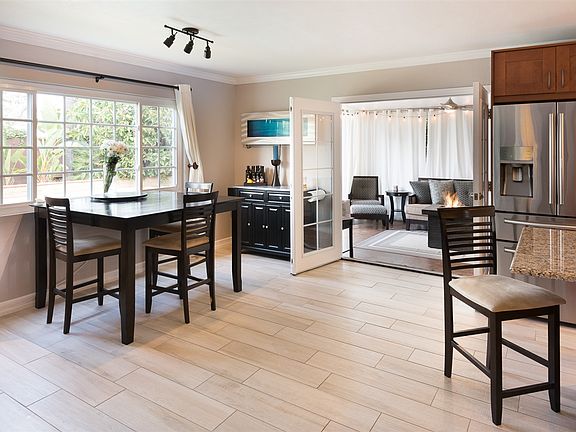 Fully updated modern home with tropical backyard oasis, open floor plan and mountain views. Large kitchen includes 5 burner gas range with dual ovens, pantry, and large center island. Master bathroom with heated floor and pebble floor jetted shower. Guest bathroom with vessel sink and oversized tub. Modern flooring, high ceilings, and recessed lighting throughout. Private backyard features outdoor living room, pool, fire pit and outdoor barbecue. A tropical oasis close to everything.