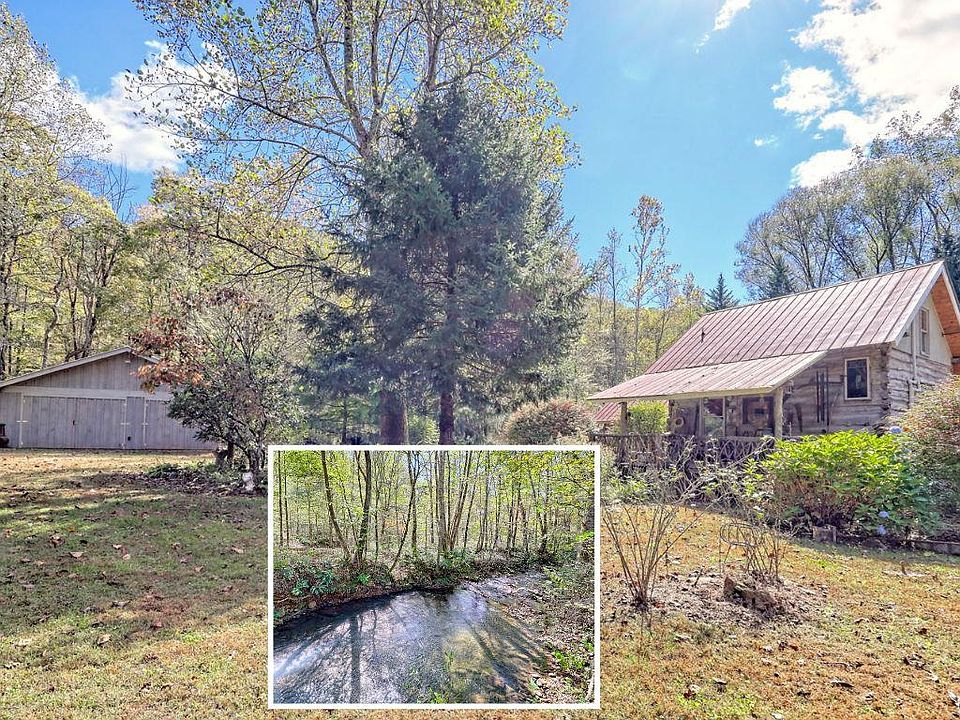Nestled at the end of a long, tree-lined driveway, Twin Oaks Heritage Cabin is a charming, fully furnished 2-bedroom, 2-bathroom hand-hewn log cabin set on 3.95 peaceful acres along Muskrat Creek. Steeped in history, this 1800s treasure began as two separate cabins on a Tennessee plantation, professionally disassembled with every original log carefully numbered, then transported and reassembled into one unified home with an added second floor and bottom floor bedroom. Thoughtfully updated by its current owners, the cabin combines modern conveniences with the warmth of traditional log cabin living. Renovations include a completely new kitchen, new bathrooms on each floor — the main level shower featuring locally found Staurolite "Fairy Crystals" set into the pebble tile flooring — and a converted pantry and laundry room. Stay cozy with a wood-burning stove and efficient mini-splits, with a wood central furnace in the attached furnace room available as backup during inclement weather. Covered porches invite you to relax and take in the stunning mountain views, while the grounds tell a story all their own: a frog pond fed by a smaller creek teems with tadpoles each spring, live Christmas trees planted over the years dot the landscape, and productive red raspberry vines, asparagus spears, and a generous bed of garlic return faithfully each season. The property also features a gray-stained 27x24 detached garage/workshop, an outbuilding, and a metal carport. With approximately 500 feet of frontage on Muskrat Creek — a flowing trout stream originating from the upper mountain range — level terrain, and unrestricted land surrounded by mountain views, this is a must-see in person to truly appreciate its charm and timeless beauty. A complete property history and feature list are available upon request. Don't miss this opportunity to own a truly unique mountain retreat!