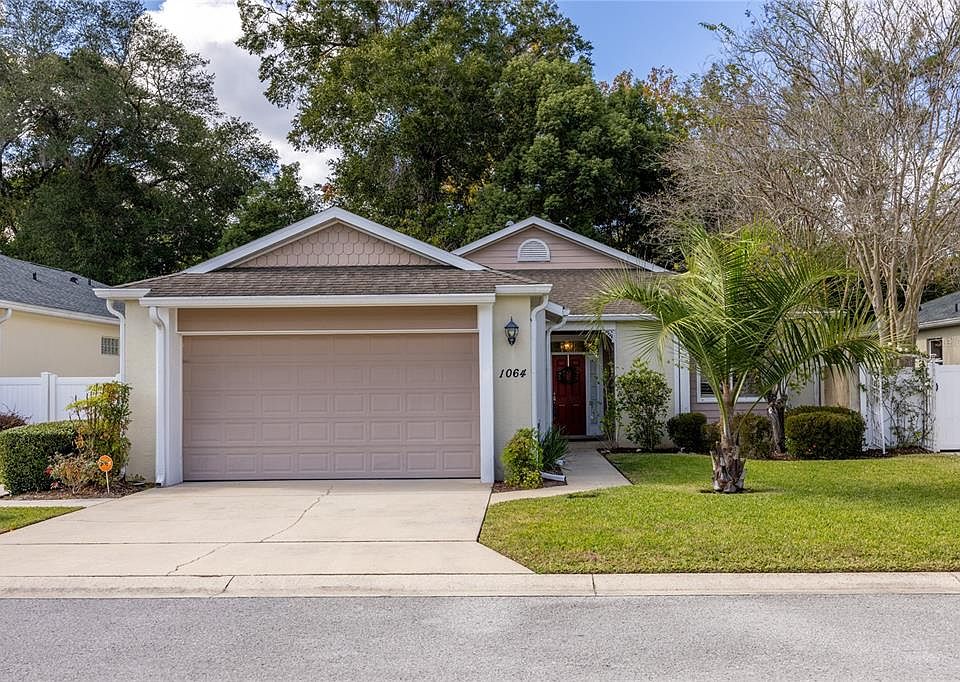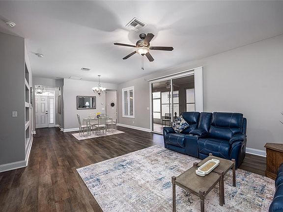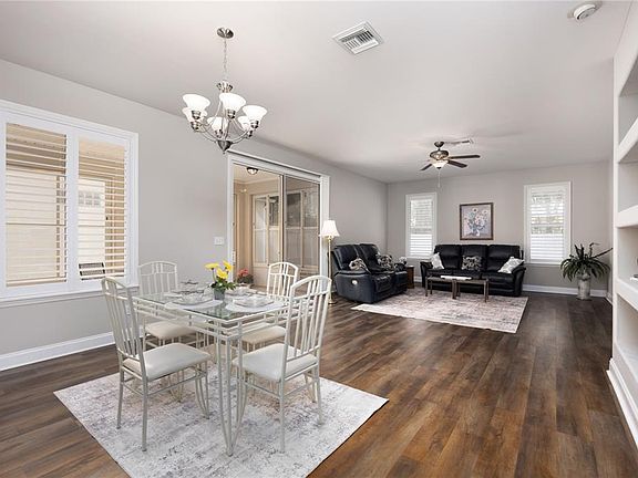 Beautifully updated 2BR/2BA villa in the sought-after Ocala Eastpointe Community. Step into this meticulously updated Carlyle model villa, ideally located —just minutes from shopping, dining, and everyday conveniences. This move-in ready home offers numerous high-end upgrades, including custom plantation shutters on every window, luxury vinyl plank flooring throughout, and gleaming granite countertops. The kitchen features a modern backsplash, neutral white cabinetry, and a spacious pantry, along with a charming breakfast nook perfect for casual dining. The open-concept great room and dining area are enhanced by soaring 10-foot ceilings and built-in shelving, offering both style and functionality. The dining space comfortably fits a full-sized dining set, ideal for entertaining. The primary suite boasts a large walk-in closet, dual vanities, a garden tub, and a step-in shower. The indoor laundry room and ample storage throughout add convenience. Washer and dryer convey, as well. Enjoy the all-weather Florida room, accessible from both the breakfast nook and great room via sliding doors. With acrylic windows, and beautiful porcelain tile, this space is perfect for year-round indoor/outdoor living. Fenced, private back yard space. Additional highlights include: alarm system, ceiling fans throughout, irrigation system, and low HOA fees. Don’t miss your chance to own this beautifully maintained, spacious villa in one of Ocala’s most welcoming communities. Worry free with NEW HOT WATER HEATER, and NEW ROOF to be installed before closing. Schedule your showing today!