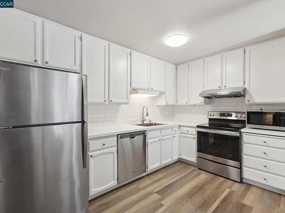 Spacious Ground-Floor 2BD/2BA Condo with Private Yard – Walk to BART! Tucked away at the back of the community for added privacy, this rarely available level-in ground-floor condo offers the perfect blend of space, style, and convenience—all in a prime Walnut Creek location. With one of the largest floor plans in the complex and a private fenced yard, this 2-bedroom, 2-bath home feels more like a townhome than a condo. Inside, enjoy tasteful updates including laminate wood flooring, quartz countertops, a custom tile backsplash, and newer stainless steel appliances. Central heat & A/C, in-unit washer/dryer, and a detached 1-car garage plus an additional assigned parking space provide modern comfort and practicality. A standout feature is the low monthly HOA dues, which are significantly lower than many other Walnut Creek communities—making this a smart long-term investment. Even better, special financing with down payment assistance may be available for qualified buyers in this neighborhood, making it even easier to make this your new home. Located just a short walk to Pleasant Hill BART, and close to freeways, shops, restaurants, and top-rated schools, this is commuter-friendly living with all the right touches. Don’t miss this rare opportunity!