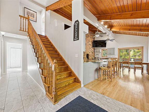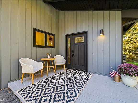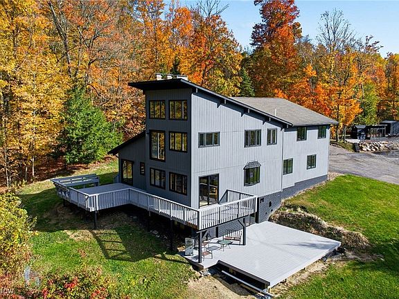 Architecturally striking, 4 bedroom, 3.5 bath, multi-level home sits on over 9 acres of private, wooded land with a layout that maximizes natural light & scenic views from every level, with expansive windows and multiple decks that create seamless indoor-outdoor living. The open-concept kitchen is the heart of the home with soaring vaulted ceilings with wood beams, sleek gray cabinetry, stainless steel appliances, large island with seating & extends into the dining area anchored by a striking exposed brick wall showcasing a woodburning fireplace, wet bar area & a set of sliders leading to spacious deck areas, making gathering & entertaining easy. The kitchen/dining area flows into the family room & features an additional fireplace & large windows that frame picturesque wooded views. The expansive primary suite is a true retreat featuring dramatic vaulted ceilings w/exposed beams, a wall of windows showcasing treetop views, brick faced fireplace & French doors that open to the ensuite bath. Two additional bedrooms & a full bath complete the 2nd floor. Additional living space in the spacious LL recreation room (currently being used as a bedroom) offering recessed lighting, brick fireplace & walk-out access to an expansive deck with serene views. Outside is over 9 wooded acres including a 2 car attached garage, a chicken coop & so much more! Recent updates include: replaced furnace & central air, added additional parking pad & built chicken coop (2022), replaced washer, dryer, dishwasher, stove, refrigerator & microwave (2023), completed lower level remodel & added walk out deck, replaced siding on front of house, painted entire exterior & replaced carpet to the bedrooms (2025). Included are all kitchen appliances, washer/dryer & tv mounts. Conveniently located near I-90, I-271, OH-44, restaurants, shopping & other local attractions.