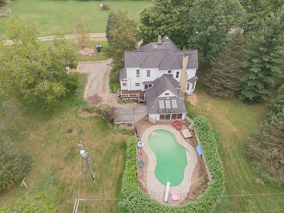 This beautifully classic centennial farmhouse sits on 40 acres of prime wooded, rolling and pasture land. The home is overflowing with character & charm, and with five bedrooms and 2.5 baths, there is enough space for everyone! With stained glass, hardwood floors, three fireplaces, original custom trim & built-ins this home can be a true piece of art. This property is genuinely a horse (cows, chickens, goats, sheep) lovers dream with two huge outbuildings - one is 66 x 90 with three 14ft sliding doors, & the other is 11,200 (140 x 80) square feet! With an in-ground pool, another two-stall garage, and lovely mature trees surrounding the home, this truly is a dream come true!