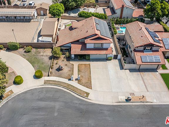 Tucked away on a quiet cul-de-sac, this beautifully remodeled 4-bedroom, 3-bathroom home combines modern elegance with everyday comfort. Step inside to find stunning laminate wood floors, soaring ceilings, and expansive windows that flood the space with natural light. The attached two-car garage has been upgraded with a custom-built gym or versatile storage area, adding functionality to the home. The chef's kitchen is an entertainer's dream, featuring a double oven, gas cooktop, French-door refrigerator, brand-new cabinetry, Carrera countertops, and a picture window with views of the backyard oasis. The inviting primary suite boasts sweeping mountain views, a generous walk-in closet, and a spa-like bathroom with dual sinks. Step outside to enjoy a heated pool and spa, fire pit, and beautifully landscaped grounds perfect for gatherings or quiet evenings under the stars. Additional highlights include central A/C and heat, recessed lighting, ceiling fans, and RV parking.