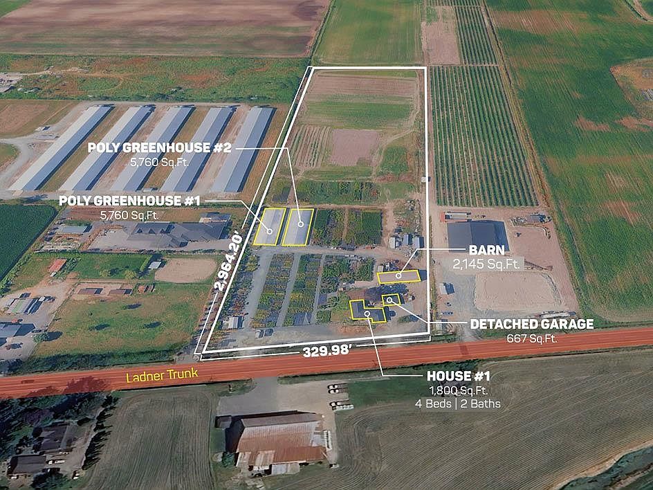 21.98 ACRES - Property offering excellent income potential. Features a 1,800 SQ/FT Home with 4 bedrooms and 2 bathrooms, plus a 667 sq. ft. detached garage. Farm infrastructure includes a 2,145 SQ/FT. Barn with three large bay doors and two poly greenhouses, 5,760 SQ/FT each. Fertile soil is ideal for vegetables, blueberries, and other crops. Currently leased to a nursery operation with the option to purchase all equipment and inventory for a turnkey business. High-traffic location close to amenities with easy access to Hwy #91, Hwy #99, and Hwy #10.
