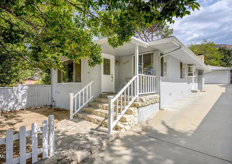 A remarkable opportunity awaits at the base of the rolling foothills of Tujunga. This charming home is a blank canvas ready for a tasteful remodel, perfectly suited for a first-time buyer looking to create their dream space or an investor seeking a promising project. The main living areas of this cozy two-bedroom, one-bathroom home are unified by rich-toned, wide-plank flooring and recessed lighting. The living room is bathed in abundant natural light from large windows that offer a peek-a-boo view of the Santa Susana Mountains to the west. The adjacent kitchen off the dining area features durable tile flooring and white tile countertops and is equipped with a stainless-steel range and dishwasher. The primary bedroom offers a brick fireplace and a large sliding glass door that opens to the backyard. The full bathroom includes a dual vanity and a shower-tub combo with a glass slider door. The home is equipped with copper plumbing and central AC, with an additional split-AC unit in the second bedroom for added comfort. In the backyard, a detached garage has been converted into two versatile bonus rooms and a three-quarter bathroom. These rooms present a fantastic opportunity for a potential Accessory Dwelling Unit (ADU) or a dedicated creative space. The private yard also includes a covered patio with tile flooring, perfect for outdoor dining and entertaining. This fantastic home provides a rare chance to get into a desirable neighborhood, inviting you to bring your vision to life and update it on your own time.