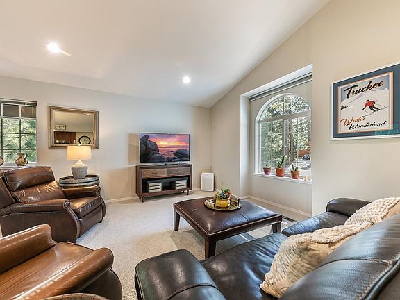 Located in one of Truckee's most sought-after neighborhoods, this nicely appointed three bedroom residence has a wonderful layout and a central location. The inviting, covered porch leads to an airlocked mudroom. Upon entry, you are greeted with a bright, sun-filled great room that receives excellent light from sunrise through sunset. The vaulted ceilings provide an open, airy feel and the beautiful chef's kitchen ensures that you will spend a lot of time on this level cooking, entertaining and relaxing by the fire. A large deck steps off of the great room offering al fresco dining amongst the pines. All three bedrooms are situated on the lower level. The primary suite offers a generously-sized bathroom and walk-in closet and features a hot tub just outside the sliding glass door. There is nice separation from the additional two bedrooms thanks to the hallway bathroom with a shower/tub combination. In addition to the two-car garage, adequate storage space is an understatement. There is almost the equivalent of the home's square footage in storage spread throughout the subfloor area. A portion of this has been converted into a home gym which could also make for an ideal media room or playroom. The newer shed with an insulated and finished interior with electricity is also a perfect space to work and play having been used as a year-round home office. Rounding out the Truckee/Tahoe lifestyle perfectly, there is additional off-street parking for an RV, boat and snowmobile trailer on the north side of the property.
