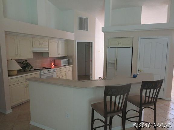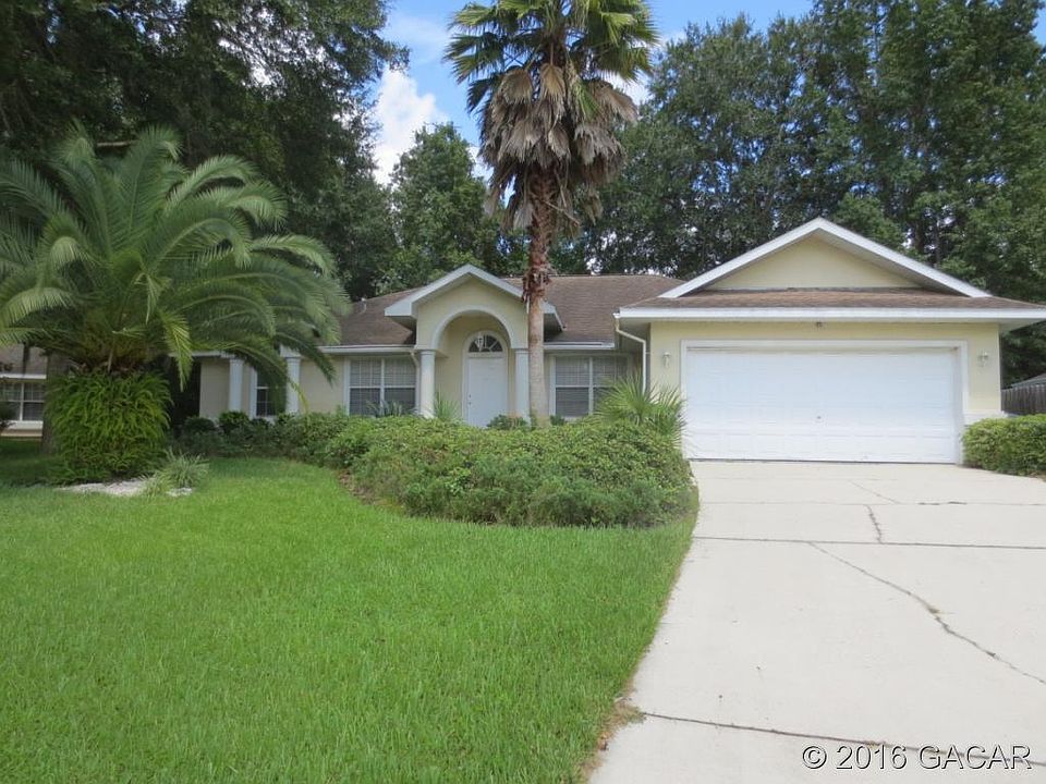 Beautiful well maintained move in ready home on a cul de sac. Large 3 bedroom 2 bath split plan with small bonus room for computer needs. Great room with vaulted ceiling and wood burning fire place. Separate dining areas, kitchen with backsplash and counter tiling, breakfast bar and breakfast nook. Master suite with tiled vanity, jetted tub and walk in closet. Tiled-carpeted floors, In ground sprinkler system and prewired security system. Community pool and clubhouse. Close to I-75 and UF. Seller to pay for HOW program.