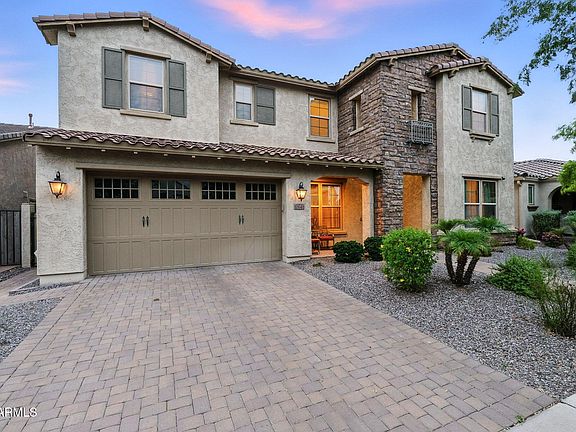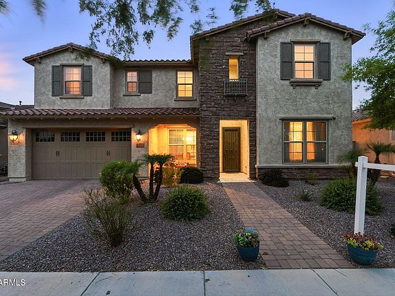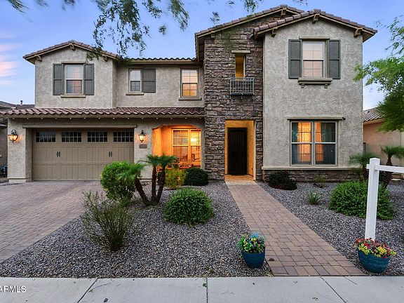 This gorgeous Eastmark home has curb appeal and the immediate wow-factor when you step inside! 4 BRs upstairs + 2 dens downstairs. The great room is open to the second floor making the home feel open and HUGE. Woodside called this floorplan the Legend for a reason! Plenty of storage: under the stairs and all four BRs have walk-in closets. The kitchen features rich brown cabinets, granite counters, stainless steel appliances, and double ovens. Designer grade light fixtures throughout. Upgraded hard floors. The backyard is tastefully designed with several trees, pavers, a covered patio, and real grass. Upgraded exterior elevation with stone from the foundation to the roof. Here's the best part: your dream home is also in your dream neighborhood! Eastmark amenities are unmatched (see more).. Community pool and community center, two lakes, concert venue, local diner, disc golf course, skate park, a new Mesa library under construction, plenty of schools to choose from in and around the community, splash pads, small green belts and playgrounds scattered throughout the community plus a giant great park, volleyball courts, baseball fields, and so much more!
