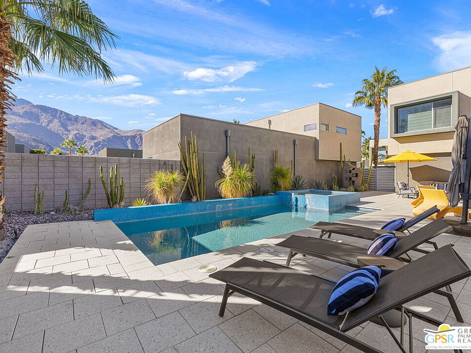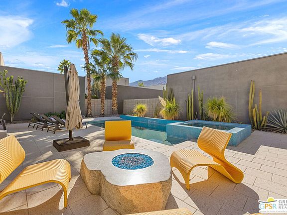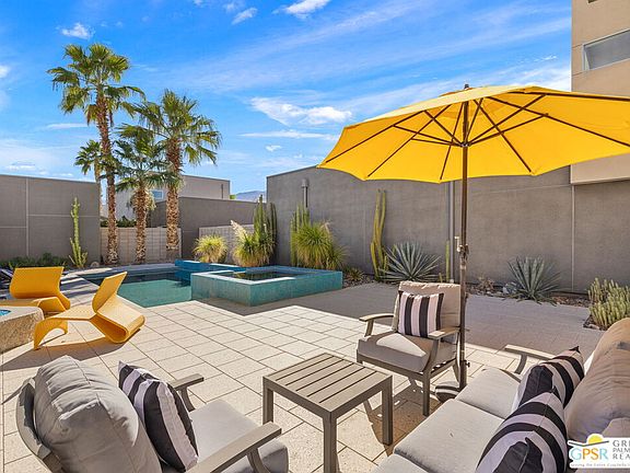 Morrison Magic in full effect. Modern design, exceptional outdoor living, and a dramatic San Jacinto mountain backdrop all come together at this ultra private residence in The Morrison. The vibe is crisp, clean, and effortless from the moment you enter, with indoor outdoor flow that places the pool and mountain views front and center. The blue tiled pool delivers instant wow factor with its spa to pool waterfall, generous sunning areas, and a modern stone fire pit that adds another striking focal point. All of it is framed by lush desert landscaping and complete privacy, creating an outdoor environment made for lingering, lounging, and entertaining in style. Inside, the modern aesthetic continues with tall ceilings, sleek finishes, and an easy, open layout. The sought after Plan 3 design offers three bedrooms and three baths, including a convenient first level bedroom and two ensuite bedrooms upstairs. Quality upgrades are found throughout, enhancing both style and function.Be it full time or seasonal, there is so much to love. Fee Land, you own it. The Morrison is gated, beautifully modern, and moments from both downtown and uptown. A rare combination of design, setting, and pure desert magic.