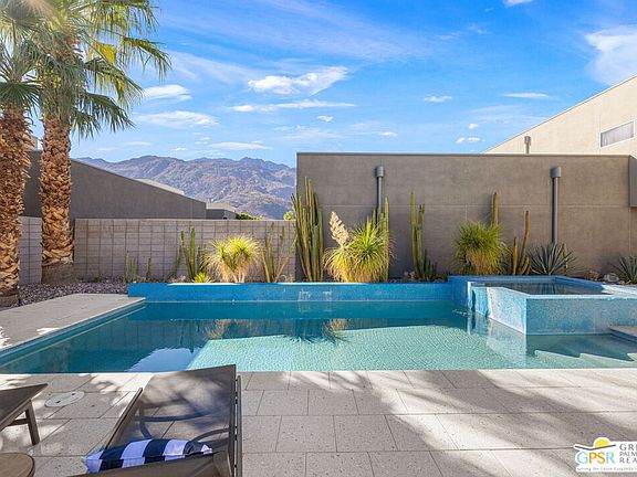 San jacinto mountain backdropQuality upgradesSpa to pool waterfallBlue tiled poolSleek finishesOpen layoutLush desert landscaping