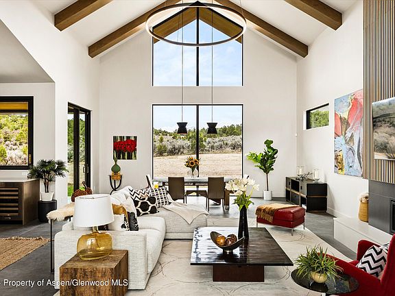 Step inside to soaring ceilings and an airy, light-filled ambiance that perfectly frames the ever-changing beauty of Mt. Sopris and down-valley vistas. The chef's kitchen features Quartz countertops, custom wood cabinetry, and oversized KitchenAid appliances. Each bedroom offers vaulted ceilings and spacious walk-in closets. Luxurious touches include radiant-heated concrete floors, central air conditioning, Room & Board vanities, acoustic fireplace panels, a dog-washing station and a fenced-in dog run.