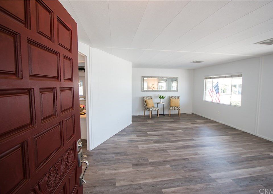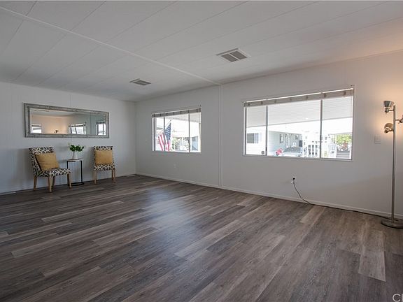 This captivating manufactured home welcomes you in with a comfortable floor plan accented with new ashwood laminate floors, abundant natural light in every room. The living room is an inviting retreat with oversized windows and lots of space. The Kitchen boasts white wood cabinetry with stainless steel hardware, stainless steel drop down pendant lighting and the kitchen is boasting new stainless steel refrigerator, dishwasher and six-grill cooktop & stainless steel fan. Picturesque views from kitchen through dining room and onto spacious covered patio for So Cal al fresco outdoor dining.Large patio with new outdoor carpeting, lead onto a large backyard with outdoor string lighting, mature trees and outdoor entertaining area. Lush trees, spacious yards, and secured gates, make this a "Dog Ready Residence". "Green thumbs" will love the planter's work room which boasts a separate 64 square foot room with new flooring, fresh paint and multi leveled shelving for urban farming & hobbies. Back inside, two brightly lit bedrooms feature abundant built-in closet systems and share two well-appointed bathrooms with white cabinetry, stainless steel hardware, new stainless steel showers. This lovely home is in a 55+ community with gated security entry, coliseum pool, tennis courts, club facility for entertaining, and hot outdoor jacquizi tub. Title must be held by person over 54 years of age, and any roommates over 18 years of age are welcomed to live in the home.