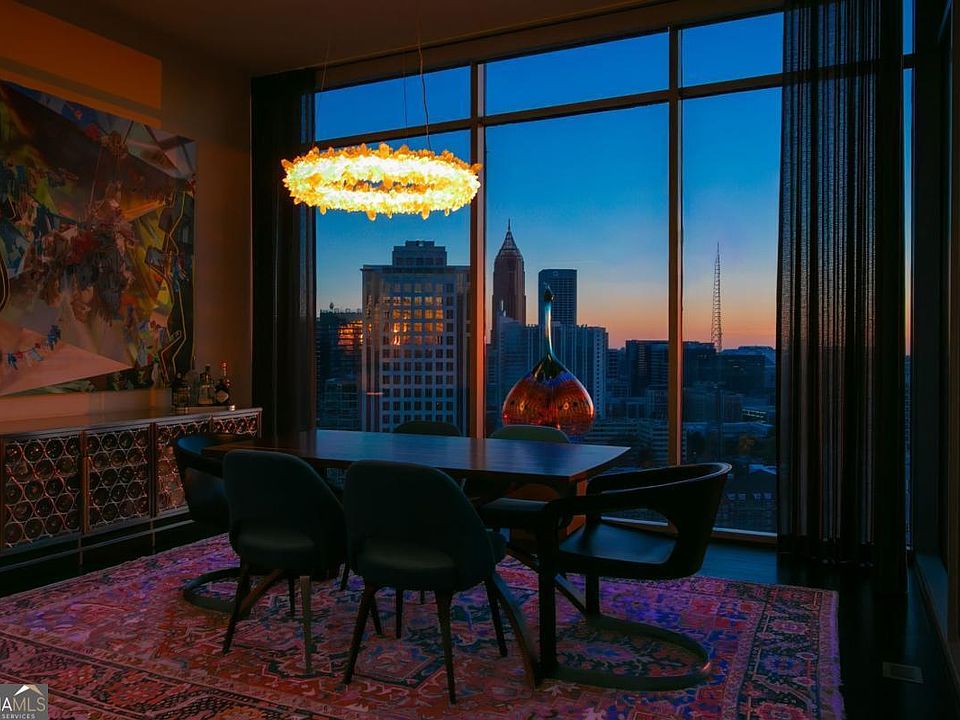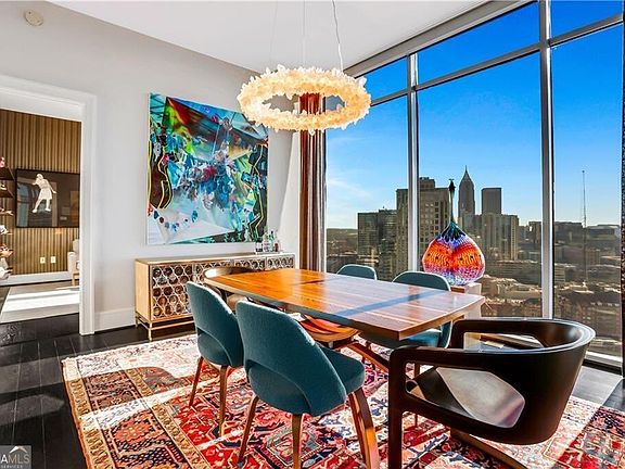 Seller offering 12 months of HOA dues paid upfront with an acceptable offer! Elevate your lifestyle in this meticulously designed 3-bedroom, 3-bathroom residence perched high above Atlanta in the 1065 Midtown residences above the Loews Atlanta Hotel. Blending luxury, artistry, and functionality, this home redefines urban living with breathtaking views, high-end finishes, and unrivaled amenities. Step into an expansive, light-filled space where floor-to-ceiling windows frame iconic views of the Atlanta skyline, stretching from Mercedes-Benz Stadium to Stone Mountain. The open-concept design flows effortlessly from the living to dining areas and into the stunning kitchen, creating a seamless space for entertaining or simply enjoying peaceful moments above the city. The Matthew Rao-designed kitchen is a true masterpiece of form and function. SieMatic cabinetry in glossy graphite gray reflects the city skyline, enhanced by bronze metal accents and custom LED lighting. A generously sized island provides ample prep and seating space, while seamlessly concealed high-end appliances elevate the minimalist aesthetic. The paneled wine chiller, refrigerator, and freezer integrate flawlessly with the cabinetry, ensuring a sleek, uninterrupted design. Caesarstone countertops, a Gaggenau induction cooktop, and a fully functional layout make this kitchen ideal for both cooking and socializing. Every detail of this home has been curated for comfort and style. Ebony flooring runs throughout, complemented by Christopher Boots designer lighting and Crestron motorized light-filtering shades. The Crestron system extends to an integrated audio setup, delivering premium sound throughout the home. The main living areas feature UV-coated windows to protect art and furniture, while custom drapery in the primary suite adds elegance and privacy. Custom built-ins in the hallway provide additional art features, and the guest bedroom and office/third bedroom feature luxurious wall coverings and tailored closets. The primary suite is a serene retreat with breathtaking views, a spa-like ensuite bath, and bespoke touches. Floating cabinetry with vessel sinks, backlit mirrors, a Victoria + Albert soaking tub, and a white Carrara marble shower make this space both elegant and functional. Custom closets and thoughtful details complete the space. This residence is a rare combination of artistry, luxury, and practicality. Residents of 1065 Midtown enjoy world-class amenities, including a heated rooftop pool, clubroom, 24/7 concierge services, and exclusive access to Loews Atlanta Hotel amenities, such as Exhale Spa, valet services, and fine dining at Ashland. Ideally located in the heart of Midtown, this residence is steps away from Piedmont Park, the High Museum, Colony Square, and Atlanta's finest dining and entertainment. Don't miss the opportunity to own this stunning home and experience the pinnacle of Midtown living. Schedule your private tour today.