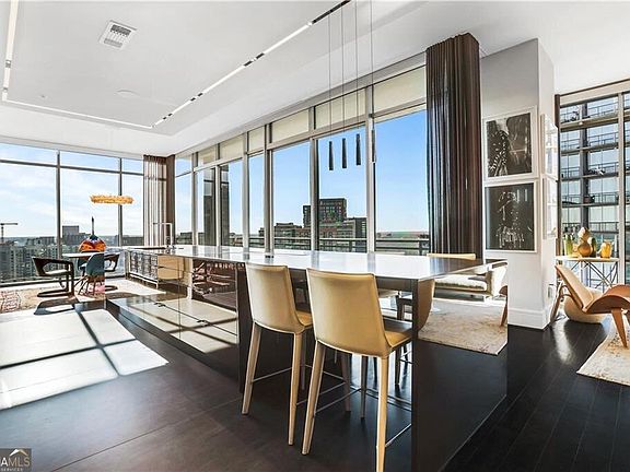 Elevate your lifestyle in this meticulously designed 3-bedroom, 3-bathroom residence perched high above Atlanta in the 1065 Midtown residences above the Loews Atlanta Hotel. Blending luxury, artistry, and functionality, this home redefines urban living with breathtaking views, high-end finishes, and unrivaled amenities. Step into an expansive, light-filled space where floor-to-ceiling windows frame iconic views of the Atlanta skyline, stretching from Mercedes-Benz Stadium to Stone Mountain. The open-concept design flows effortlessly from the living to dining areas and into the stunning kitchen, creating a seamless space for entertaining or simply enjoying peaceful moments above the city. The Matthew Rao-designed kitchen is a true masterpiece of form and function. SieMatic cabinetry in glossy graphite gray reflects the city skyline, enhanced by bronze metal accents and custom LED lighting. A generously sized island provides ample prep and seating space, while seamlessly concealed high-end appliances elevate the minimalist aesthetic. The paneled wine chiller, refrigerator, and freezer integrate flawlessly with the cabinetry, ensuring a sleek, uninterrupted design. Caesarstone countertops, a Gaggenau induction cooktop, and a fully functional layout make this kitchen ideal for both cooking and socializing. Every detail of this home has been curated for comfort and style. Ebony flooring runs throughout, complemented by Christopher Boots designer lighting and Crestron motorized light-filtering shades. The Crestron system extends to an integrated audio setup, delivering premium sound throughout the home. The main living areas feature UV-coated windows to protect art and furniture, while custom drapery in the primary suite adds elegance and privacy. Custom built-ins in the hallway provide additional art features, and the guest bedroom and office/third bedroom feature luxurious wall coverings and tailored closets. The primary suite is a serene retreat with breathtaking views, a spa-like ensuite bath, and bespoke touches. Floating cabinetry with vessel sinks, backlit mirrors, a Victoria + Albert soaking tub, and a white Carrara marble shower make this space both elegant and functional. Custom closets and thoughtful details complete the space. This residence is a rare combination of artistry, luxury, and practicality. Residents of 1065 Midtown enjoy world-class amenities, including a heated rooftop pool, clubroom, 24/7 concierge services, and exclusive access to Loews Atlanta Hotel amenities, such as Exhale Spa, valet services, and fine dining at Saltwood. Ideally located in the heart of Midtown, this residence is steps away from Piedmont Park, the High Museum, Colony Square, and AtlantaCOs finest dining and entertainment. DonCOt miss the opportunity to own this stunning home and experience the pinnacle of Midtown living. Schedule your private tour today.