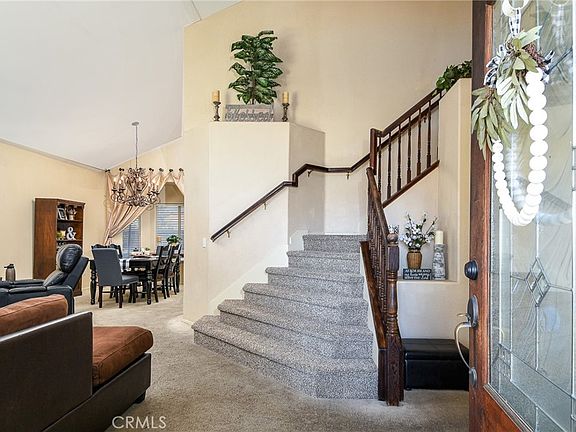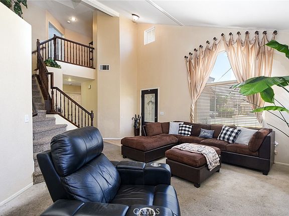 5 of the bedrooms have newer carpet and paint. Impressive stair case with light and bright living room and formal dining room with custom drapery are ample in size and have high ceilings. Kitchen with luxury vinyl flooring has plenty of cupboard space and some stainless steel appliances with breakfast counter bar. Family room has cozy fireplace and french doors to the backyard. Located in a cul de sac and close to schools and shopping. Backyard has block wall fencing and plenty of area for fun games around the pool. A must see. No mello roos, No solar, No HOA.